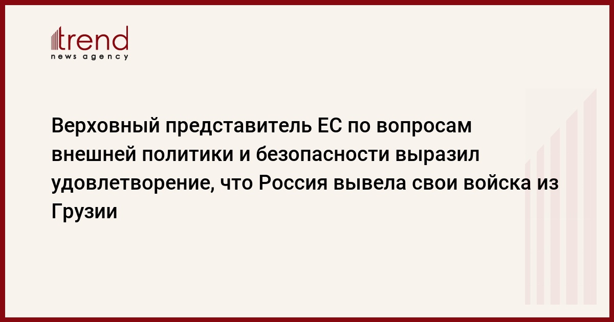 Верховный представитель ЕС по вопросам внешней политики и безопасности Хавьер Солана подтвердил, что Россия вывела свои войска из так называемых буферных зон Грузии (территории, прилегающие к Южной Осетии и Абхазии), в соответствии с ранее достигнутыми договоренностями. В своем заявлении Х.Солана отметил, что он счастлив, что вывод российских войск с указанных территорий завершен. Данный шаг, считает верховный представитель ЕС по вопросам внешней политики и безопасности, позволит беженцам вернуться в свои дома, а также приведет к нормализации условий жизни, передает РБК со ссылкой на Reuters.