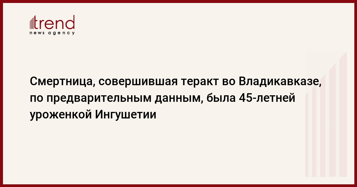 Террористка-смертница, совершившая накануне теракт во Владикавказе, по предварительным данным, была 45-летней уроженкой Ингушетии, сообщили в правоохранительных органах Северной Осетии. В настоящее время следствие по делу о теракте располагает фотороботом террористки, составленным на основании показаний свидетелей и по результатам анализа ее останков. По данным следствия, женщина взорвала себя во время посадки в маршрутное такси, передает РБК.