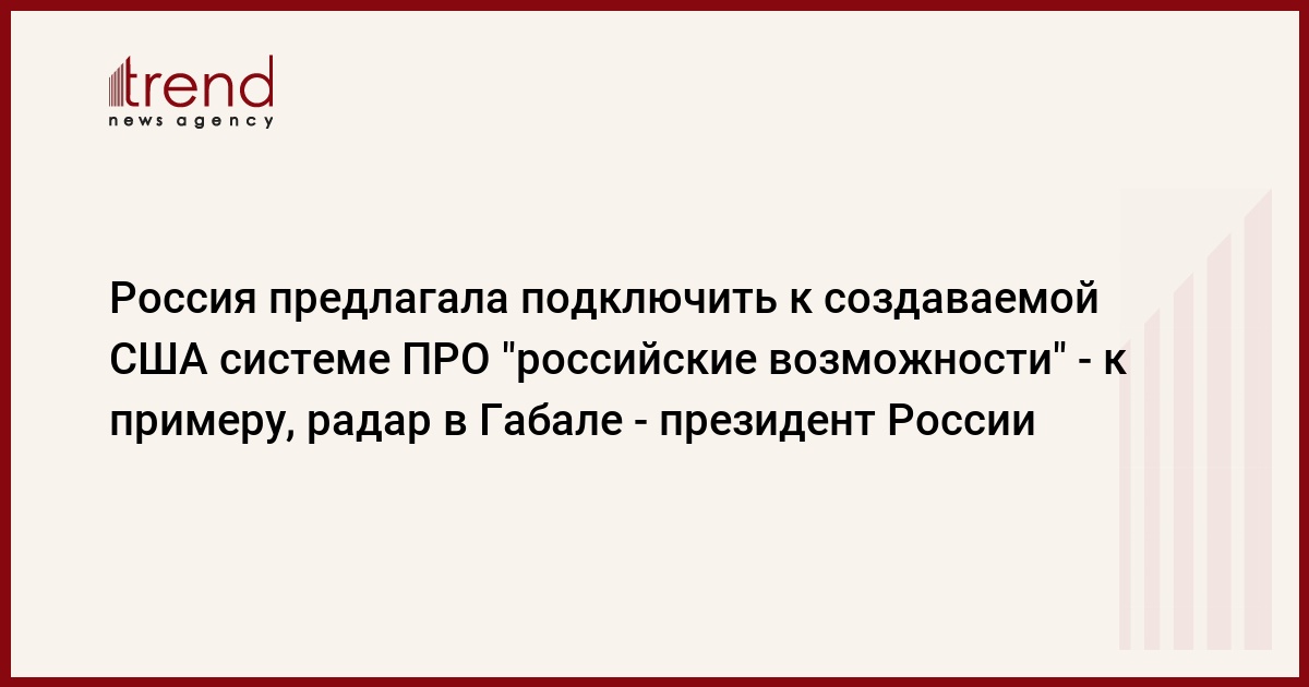 Россия, в частности, предлагала подключить к создаваемой США системе ПРО "российские возможности" - к примеру, радар в Габале /Азербайджан/. Это подтвердил президент РФ Дмитрий Медведев, выступая в субботу в Вашингтоне во влиятельной неправительственной научно-исследовательской организации - Совете по международным отношениям, передает ИТАР-ТАСС. При этом он в очередной раз подчеркнул, что Россия первой принимать контрмеры в ответ на планы создания Соединенными Штатами системы ПРО не намерена. "Мы действительно абсолютно не хотим ничего размещать", - сказал Медведев. Он напомнил, что замыслы развертывания станции радиолокационного слежения в Чехии и базы 10 ракет-перехватчиков в Польше - это "не наша выдумка". "С самого начала наша позиция заключалась в том, чтобы договариваться с американцами", - заявил Медведев.
