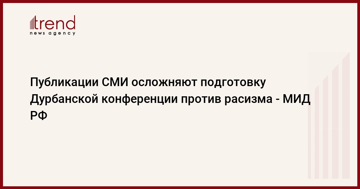 "К сожалению, имеют место публикации, искажающие как итоги Всемирной конференции по борьбе против расизма, расовой дискриминации, ксенофобии и связанной с ними нетерпимостью, так и ход подготовительного процесса к обзорной конференции по выполнению Дурбанской декларации и программы действий по борьбе с расизмом, расовой дискриминацией, ксенофобией и связанной с ними нетерпимостью. Видимо, такого рода публикации направлены на то, чтобы осложнить процесс подготовки к конференции и воспрепятствовать достижению согласия", - говорится в документе, опубликованном на сайте МИД.