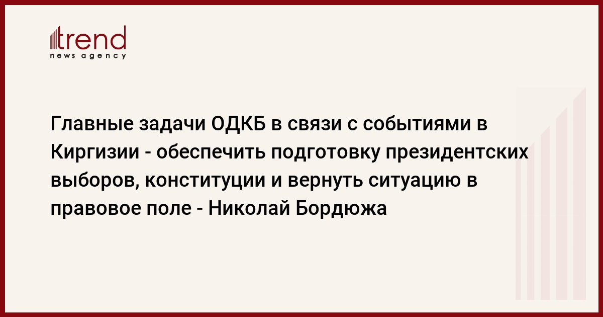 Главные задачи ОДКБ в связи с событиями в Киргизии - обеспечить подготовку президентских выборов, конституции и вернуть ситуацию в правовое поле. Об этом заявил сегодня генеральный секретарь ОДКБ Николай Бордюжа, говоря об итогах неформального саммита Совета коллективной безопасности организации 8 мая в подмосковных Горках, сообщает ИТАР-ТАСС.