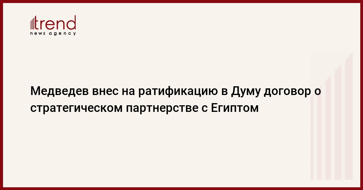 Президент России Дмитрий Медведев внес в Госдуму на ратификацию договор о стратегическом партнерстве между РФ и Египтом, определяющий ключевые направления сотрудничества двух стран, передает РИА Новости.