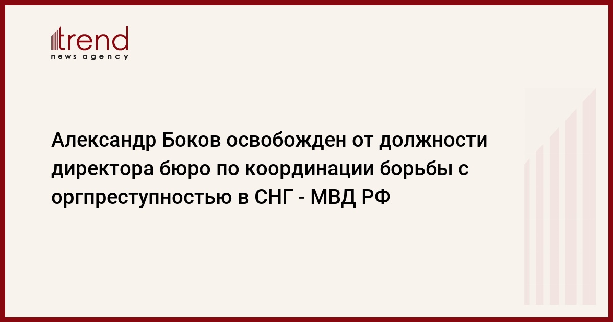 Генерал-лейтенант милиции Александр Боков, арестованный по обвинению в мошенничестве на 46 миллионов долларов, освобожден от должности директора бюро по координации борьбы с оргпреступностью на территории стран СНГ, сообщает пресс-центр МВД РФ.