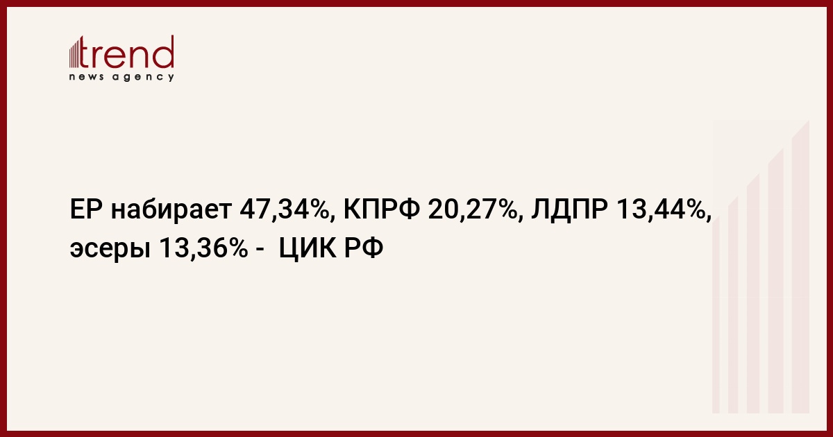 "Единая Россия" набирает 47,34% голосов, КПРФ - 20,27%, ЛДПР - 13,44%, "Справедливая Россия" - 13,36%, "Яблоко" - 2,6%, "Патриоты России" - 1,01%, "Правое дело" - 0,55% после обработки 26,5% протоколов избирательных комиссий, свидетельствуют данные Центризбиркома, сообщает РИА Новости.