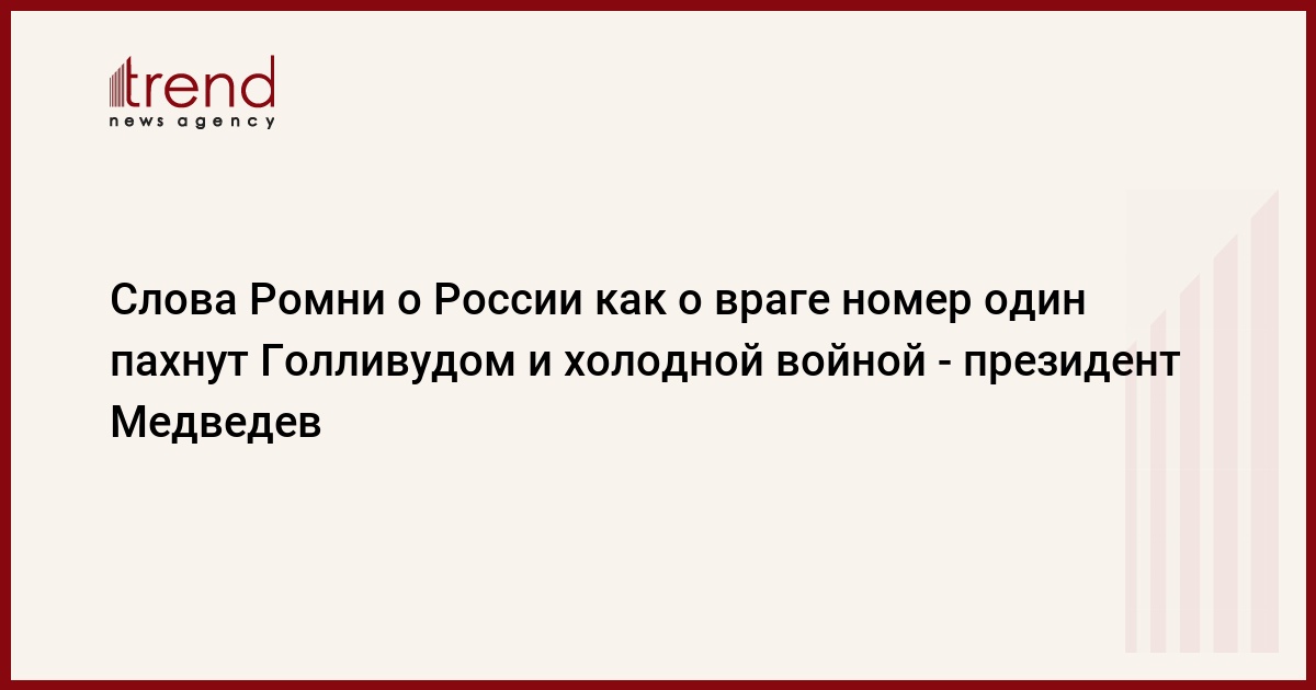 "В том, что касается различных идеологических клише - я всегда опасаюсь, когда та или иная сторона использует конструкции типа "враг номер один", это пахнет Голливудом и определенными временами. Поэтому я бы рекомендовал бы всем претендентам на кресло президента США, не исключая того, о ком вы сказали (Митт Ромни), как минимум две вещи: во-первых, при формулировании позиции все-таки включать доводы рассудка, использовать голову - это для кандидата в президенты невредно, а во-вторых, посматривать на часы - сейчас 2012 год, а не середина 70-х годов, и к какой бы партии кто бы ни относился, он должен принимать во внимание политические реалии", - сказал Медведев.