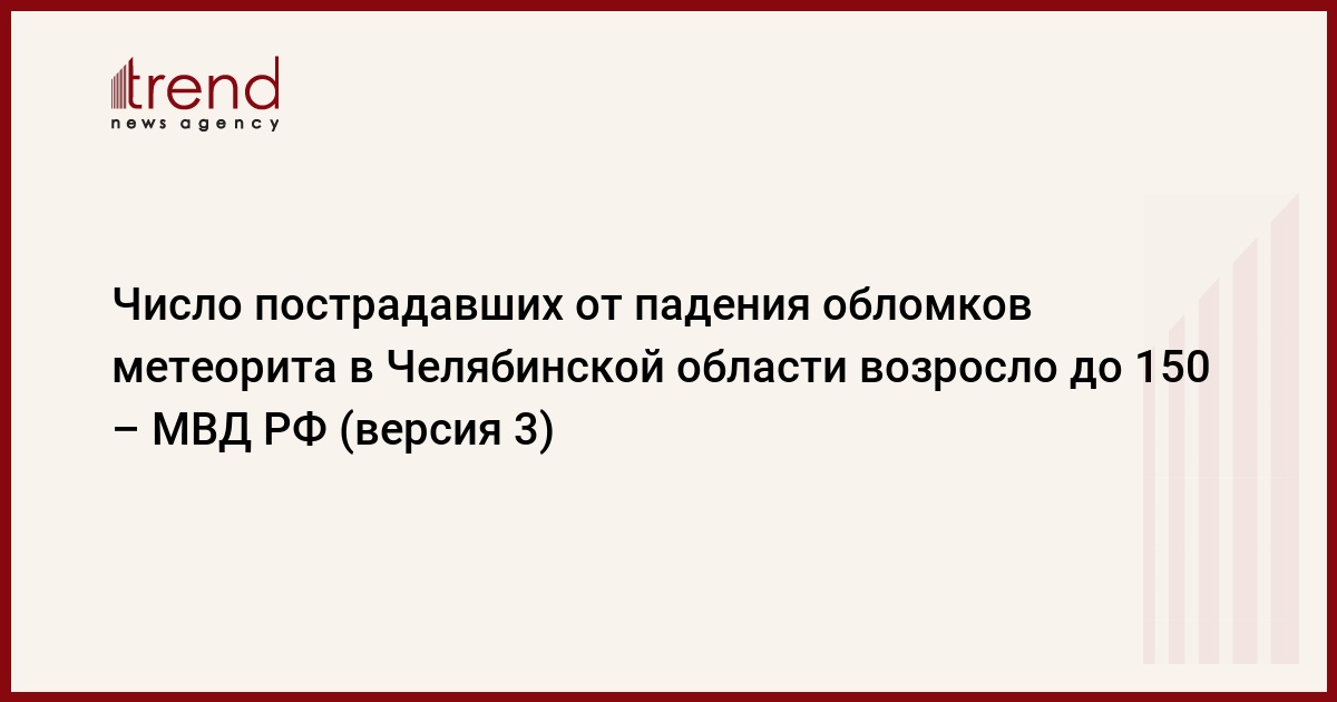 Число пострадавших от падения обломков метеорита в Челябинской области возросло до 150 человек, сообщил РИА Новости представитель пресс-центра МВД РФ.