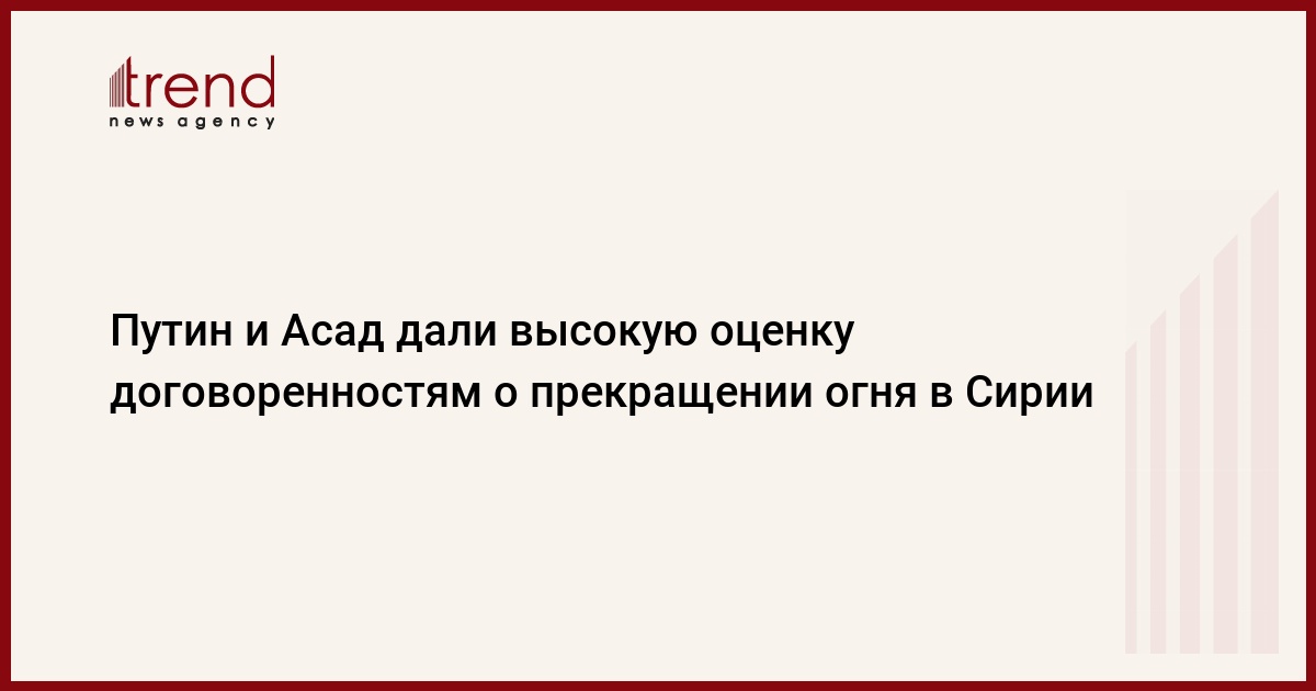 Президенты России и Сирии Владимир Путин и Башар Асад в состоявшемся в четверг телефонном разговоре дали высокую оценку достигнутым при посредничестве России и Турции договоренностям о прекращении огня и переходе к политическому процессу в Сирии. Об этом сообщила пресс-служба Кремля, передает ТАСС.