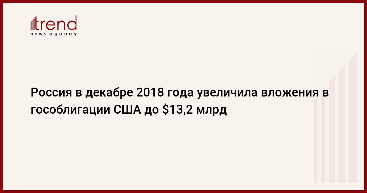 Россия увеличила объем вложений в ценные бумаги американского правительства до $13,216 млрд в декабре 2018 года. В ноябре эта сумма составляла $12,814 млрд, свидетельствуют опубликованные в пятницу министерством финансов США данные, передает Trend со ссылкой на ТАСС.