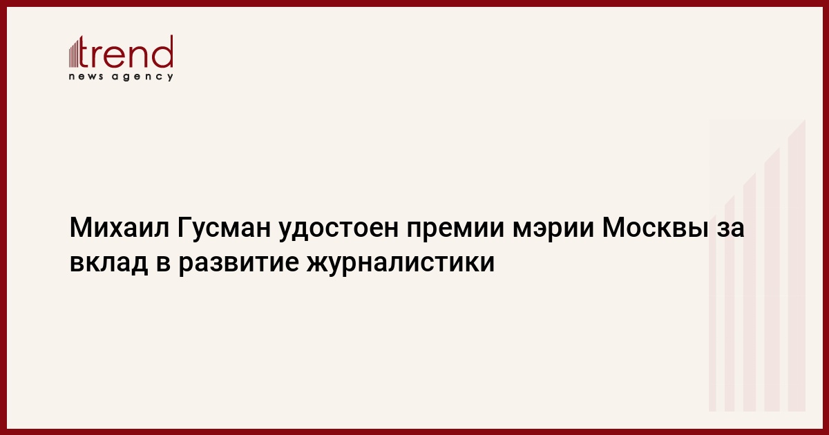 Первый заместитель генерального директора информационного агентства ТАСС Михаил Гусман удостоен премии мэрии Москвы "за заслуги в развитии отечественной журналистики и многолетнюю плодотворную работу по освещению жизни столичного мегаполиса в зарубежных русскоязычных средствах массовой информации". Как передает Trend со ссылкой на TACC, торжественная церемония вручения наград журналистам, приуроченная ко Дню российской печати, состоялась в среду в парадном Белом зале столичной мэрии.