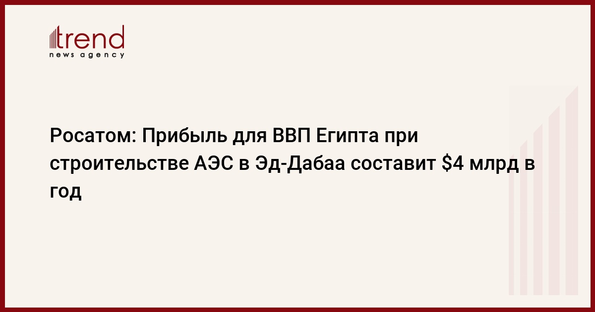 Добавленная стоимость к ВВП Египта от реализации проекта строительства первой в арабской республике атомной электростанции (АЭС) в Эд-Дабаа на Средиземном море только на этапе строительства составит $4 млрд в год. Об этом говорится в пресс-релизе Росатома, полученном ТАСС во вторник, передает Trend.