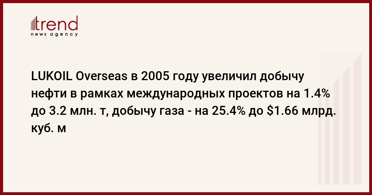 LUKOIL Overseas (оператор международных up-stream проектов ЛУКОЙЛа) в 2005 году, по предварительным данным, увеличил добычу нефти за пределами РФ на 1.4% до 3.155 млн. т с 3.11 млн. т годом ранее. Как передает Trend , об этом говорится в сообщении компании.