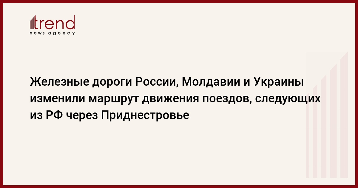 ОАО "Российские железные дороги" (РЖД) совместно с железными дорогами Молдавии и Украины приняли решение об изменении маршрута движения пассажирских поездов, следующих из России через Приднестровье. Как передает Trend , об этом сообщает пресс-служба РЖД. В настоящее время пассажирские поезда следуют от Кишинева через Унгены, Окницу и Могилев-Подольский на Жмеринку. С 10 марта был отменен скорый поезд Кишинев-Адлер формирования железных дорог Молдавии. Кроме того, было разработано новое расписание следования поездов