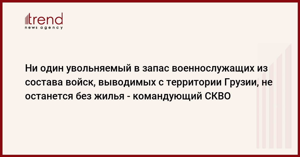 Hи один увольняемый в запас военнослужащих из состава войск, выводящихся с территории Грузии, не останется без жилья. Об этом заявил сегодня командующий войсками Северо-Кавказского военного округа /СКВО/ генерал армии Александр Баранов, сообщает Trend со ссылкой на ИТАР-ТАСС.