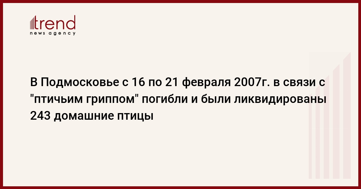 В Московской области в период с 16 по 21 февраля 2007г. от "птичьего гриппа" погибли 243 птицы. Как сообщили РБК в Министерстве сельского хозяйства Московской области, в частных подсобных хозяйствах, где обнаружен опасный вирус, были ликвидированы 193 птицы.
