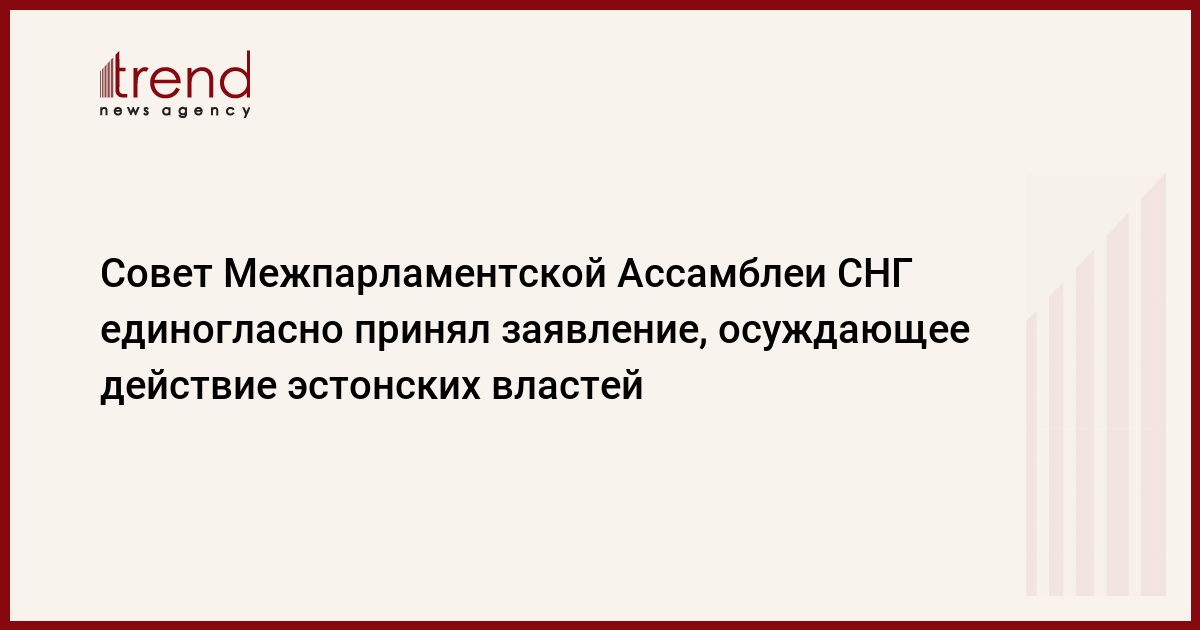 Действия эстонских властей являются "беспрецедентным актом вандализма". Об этом говорится в принятом единогласно сегодня Советом Межпарламентской Ассамблеи СНГ заявлении "О действиях властей Эстонской Республики по демонтажу памятника Воину-освободителю и перезахоронению праха советских воинов, павших в боях за освобождение Таллина от фашисткой оккупации".