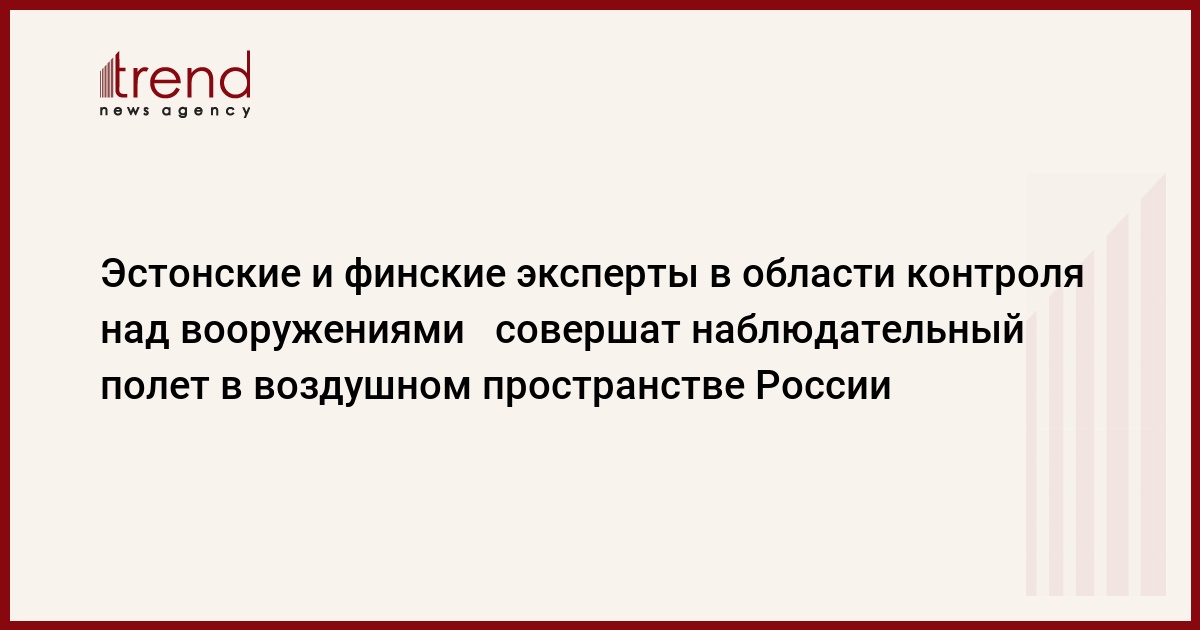 Эстонские и финские специалисты в области контроля над вооружениями совершат совместный наблюдательный полет в воздушном пространстве Российской Федерации. Как сообщили в главном штабе Сил обороны Эстонии, полет состоится в период с 13 по 17 августа. Точное время и маршрут полеты пока не известны, передает ИТАР-ТАСС .