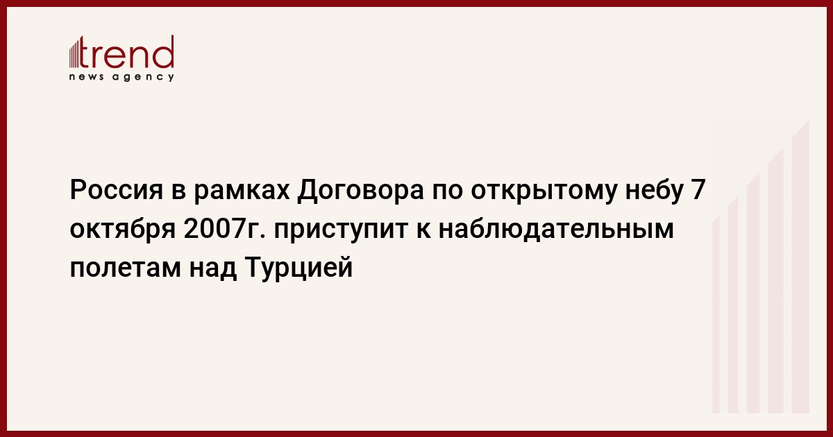Российская миссия в рамках реализации международного Договора по открытому небу 7 октября 2007г. приступит к осуществлению наблюдательных полетов над территорией Турции на самолете Ан-30Б. Как сообщает управление информации и общественных связей Министерства обороны РФ, в ходе полетов дальностью до 1,5 тыс. км по согласованному маршруту турецкие и российские специалисты будут контролировать соблюдение положений, предусмотренных договором. Полеты будут выполняться с аэродрома в Турции до 11 октября 2007г., передает РБК .