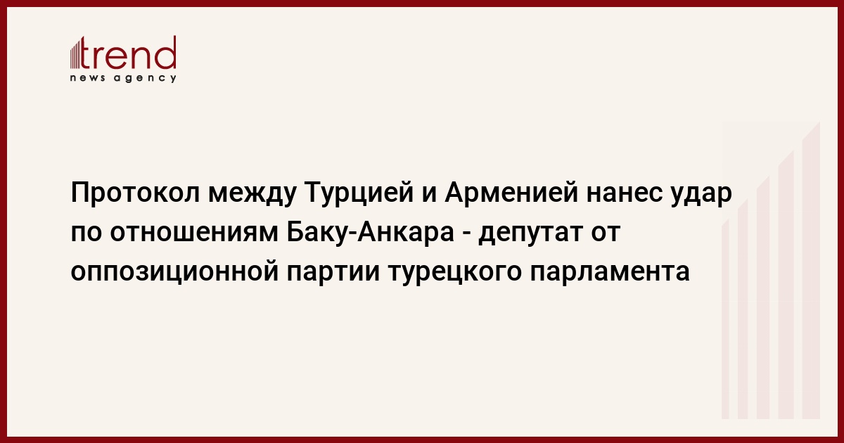 Турецко-армянский протокол нанес удар по отношениям Турции и Азербайджана, сказал в среду депутат от оппозиционной Национальной республиканской партии Шюкри Элекдаг, сообщает телеканал TRT 3.