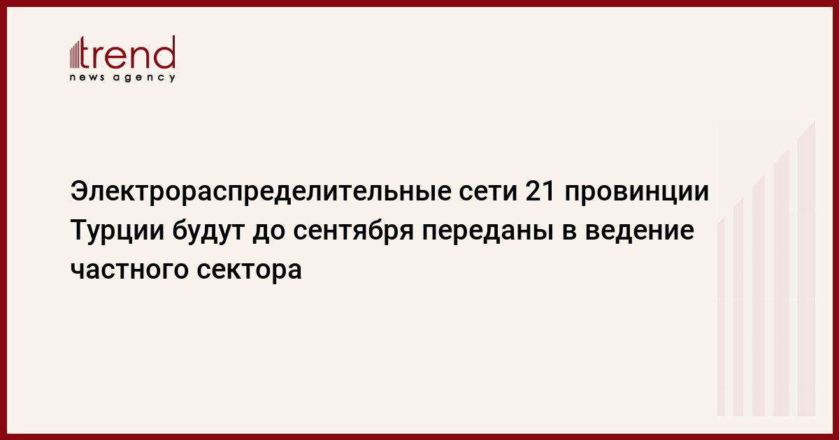 До начала сентября 2013 года электрораспределительные сети 21 провинции Турции будут переданы частному сектору, сказал министр энергетики и природных ресурсов Турции Танер Йылдыз, сообщает в среду агентство "Anadolu".