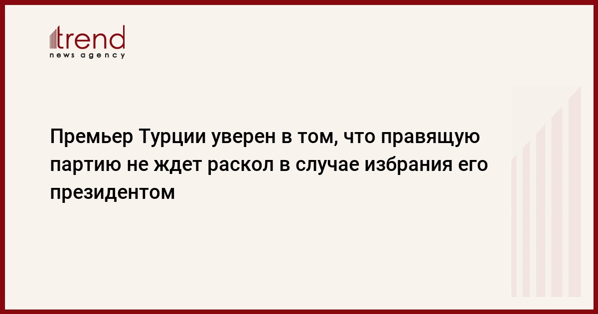 Премьер-министр Турции Реджеп Тайип Эрдоган уверен в том, что правящую Партию справедливости и развития (ПСР) не ждет потеря власти или раскол в случае избрания его президентом, сообщает во вторник турецкая газета Hurriyet Daily news.