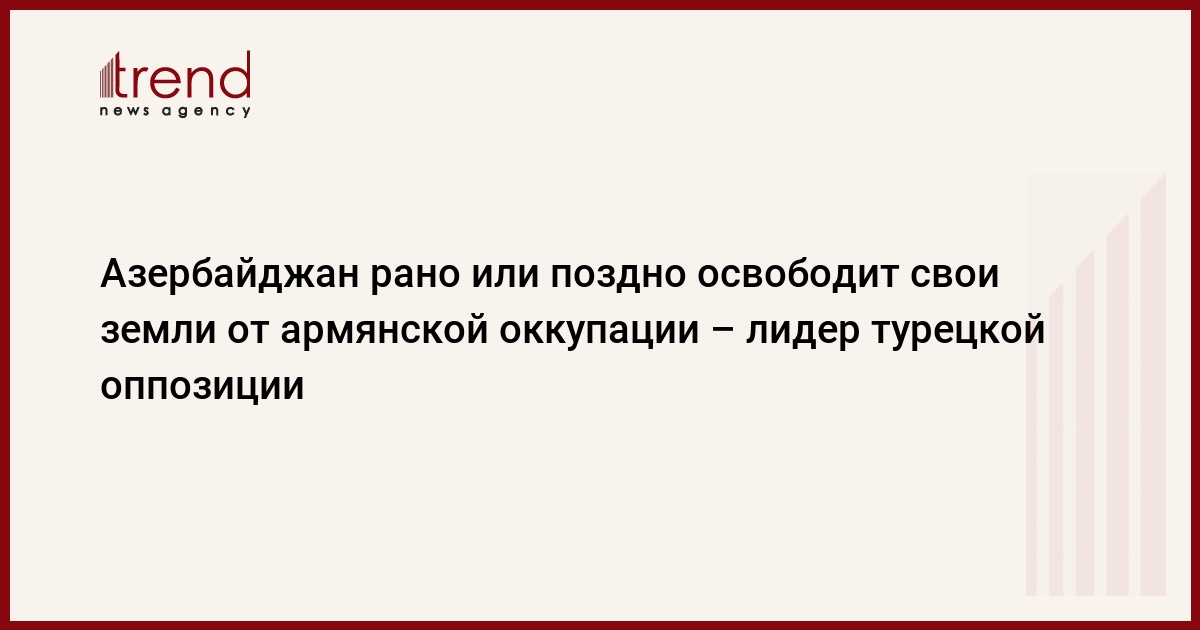 БАКУ /Trend/ - Армения должна знать, что Азербайджан рано или поздно освободит свои земли от оккупации, сказал лидер Партии националистического движения (MHP) Турции Девлет Бахчели, сообщают во вторник турецкие СМИ.