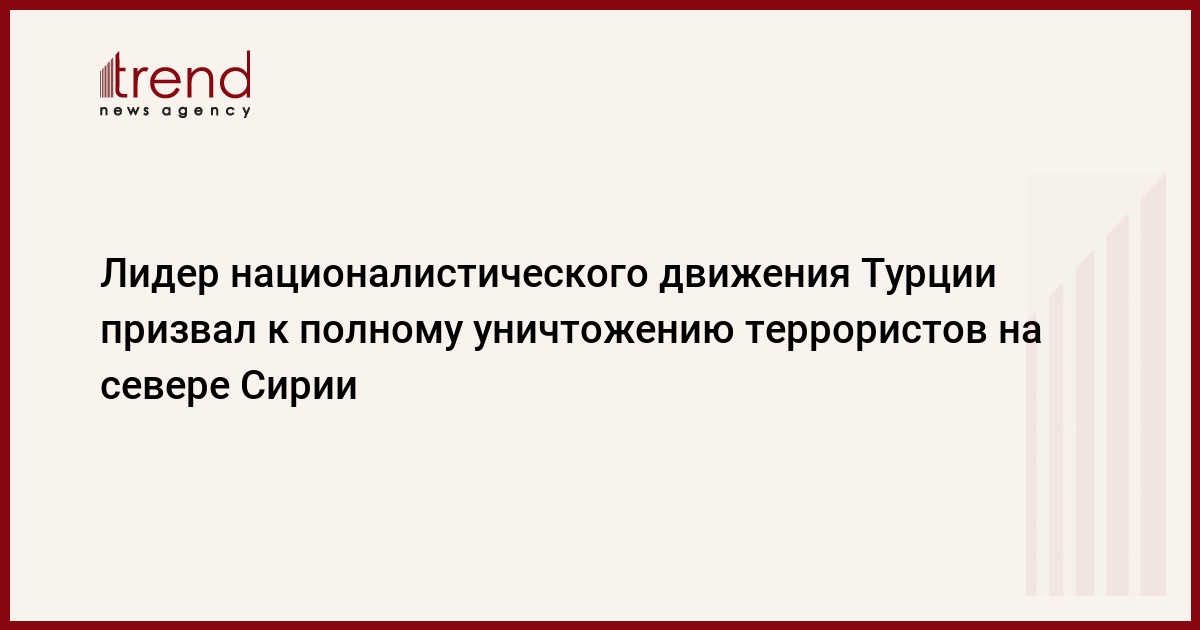 БАКУ /Trend/ - Лидер оппозиционной Партии националистического движения (MHP) Турции Девлет Бахчели призвал к полному уничтожению террористов на севере Сирии. Об этом сообщает в четверг Trend со ссылкой на турецкие СМИ.