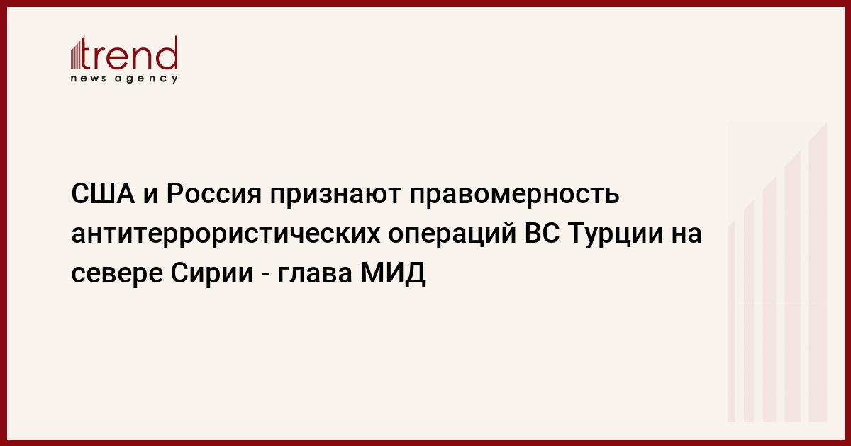 БАКУ /Trend/ - США и Россия признают правомерность антитеррористических операций ВС Турции на севере Сирии. Об этом сказал глава МИД Турции Мевлют Чавушоглу, пишет в среду Trend со ссылкой на турецкие СМИ.