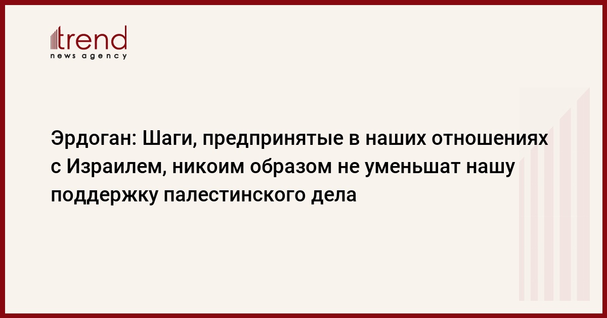 Президент Реджеп Тайип Эрдоган сказал: «Шаги, предпринятые в наших отношениях с Израилем, никоим образом не уменьшат нашу поддержку палестинского дела, напротив, наши палестинские братья также заявляют, что эти шаги будут способствовать решению палестинского вопроса и улучшение положения палестинского народа», передает Trend со ссылкой на "Анадолу".