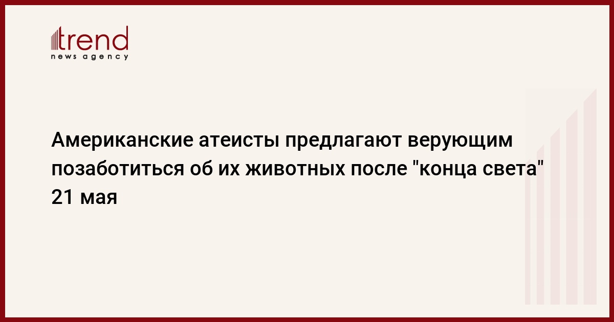 В преддверии "конца света", объявленного американским проповедником Гарольдом Кемпингом, в США появилась новая услуга: расторопные атеисты предлагают позаботиться (небезвозмездно) о питомцах верующих людей в случае, если 21 мая действительно случится апокалипсис, пишет Интерфакс.