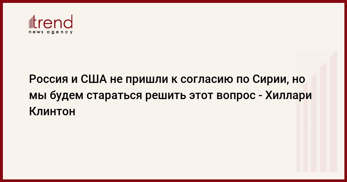 "Необходимо быть реалистами, - отметила Клинтон, комментируя переговоры с российской стороной, - мы не пришли к согласию по вопросу Сирии. Такое положение дел может сохраниться в будущем. Но это не значит, что мы не будем стараться решить этот вопрос. Мы продолжим сотрудничество с теми, кто поддерживает нас в данном вопросе и с сирийской оппозицией", сообщает РБК.