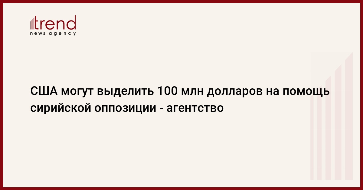 Власти США в ближайшее время могут выделить порядка 100 миллионов долларов на помощь сирийской оппозиции, противостоящей правительству президента страны Башара Асада, сообщает агентство Рейтер со ссылкой на источник в правительстве США.