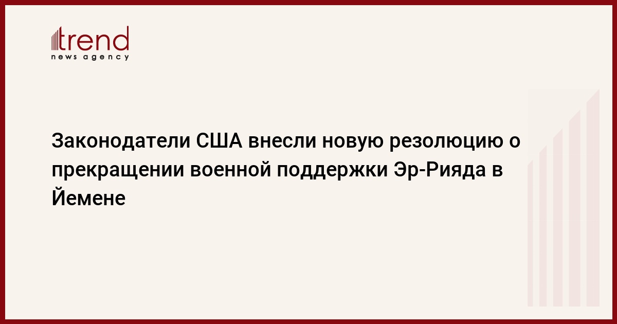 Группа законодателей, представляющих как Палату представителей, так и Сенат Конгресса США, внесла в обе палаты новую резолюцию, которая содержит призыв к американскому президенту Дональду Трампу прекратить всякую военную поддержку участникам вооруженного конфликта в Йемене. Об этом сообщается в распространенном в среду совместном заявлении законодателей, передает Trend со ссылкой на ТАСС.