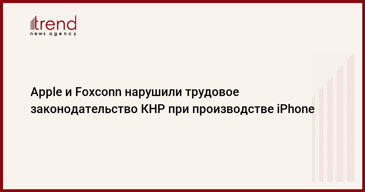 Американская компания Apple ("Эппл") и ее главный подрядчик, крупнейший в мире контрактный производитель электроники Foxconn ("Фоксконн") нарушили трудовое законодательство Китая из-за того, что злоупотребляли наймом временных сотрудников на завод по производству смартфонов iPhone ("Айфон") в китайском Чжэнчжоу. Об этом в понедельник со ссылкой на расследование неправительственной организации China Labor Watch ("Чайна лэйбор уотч", CLW) сообщило агентство Блумберг, передает Trend со ссылкой на ТАСС.