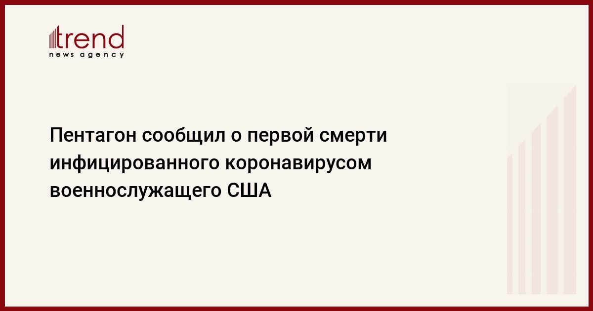 Министр обороны США Марк Эспер сообщил, что первый американский военнослужащий умер после инфицирования коронавирусом нового типа. Об этом говорится в опубликованном в понедельник на официальном сайте Пентагона заявлении, передает Trend со ссылкой на ТАСС.