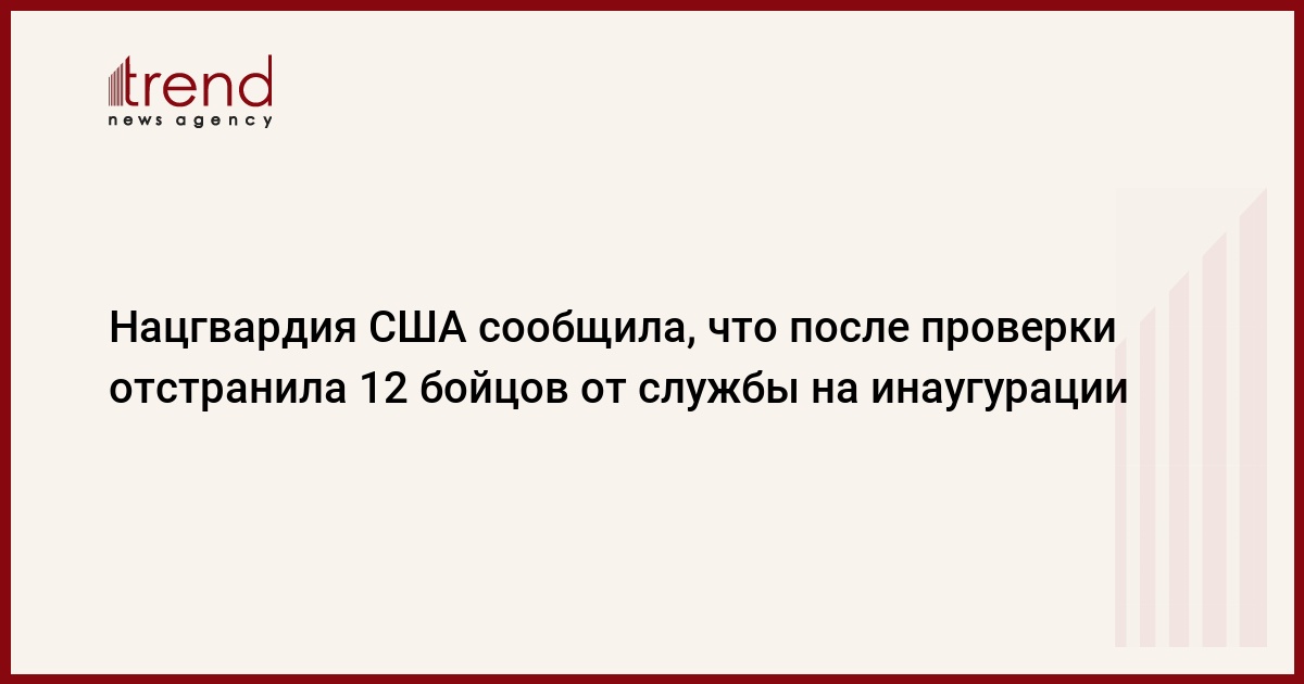 Командующий Национальной гвардией США генерал Дэниел Хокансон сообщил во вторник об отстранении от несения службы на инаугурации президента 12 военнослужащих. Соответствующие цифры Хокансон обнародовал на брифинге в Пентагоне, передает Trend со ссылкой на ТАСС.
