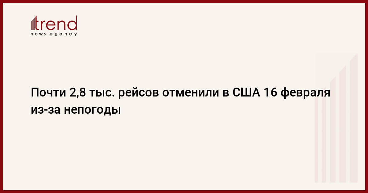Почти 2,8 тыс. рейсов отменены в США во вторник из-за резкого похолодания и ухудшения погодных условий. Соответствующие данные опубликованы на портале FlightAware, отслеживающем передвижения воздушных судов, передает Trend со ссылкой на ТАСС.