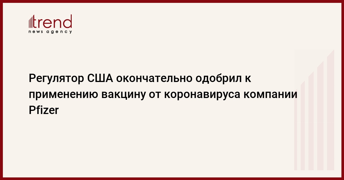 Управление по вопросам качества продовольствия и медикаментов (FDA) США в понедельник окончательно одобрило к применению вакцину от коронавируса, разработанную американской компанией Pfizer и ее германским партнером BioNTech. Об этом сообщила газета The Washington Post, передает Trend со ссылкой на ТАСС.