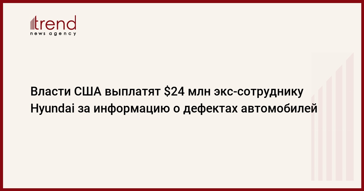 Бывший сотрудник компании Hyundai получит от властей США $24 млн за передачу информации о конструктивных дефектах в двигателях южнокорейских автомобилей, продававшихся в стране. Об этом во вторник сообщило Национальное управление дорожной безопасности США на своем сайте, передает Trend со ссылкой на ТАСС.