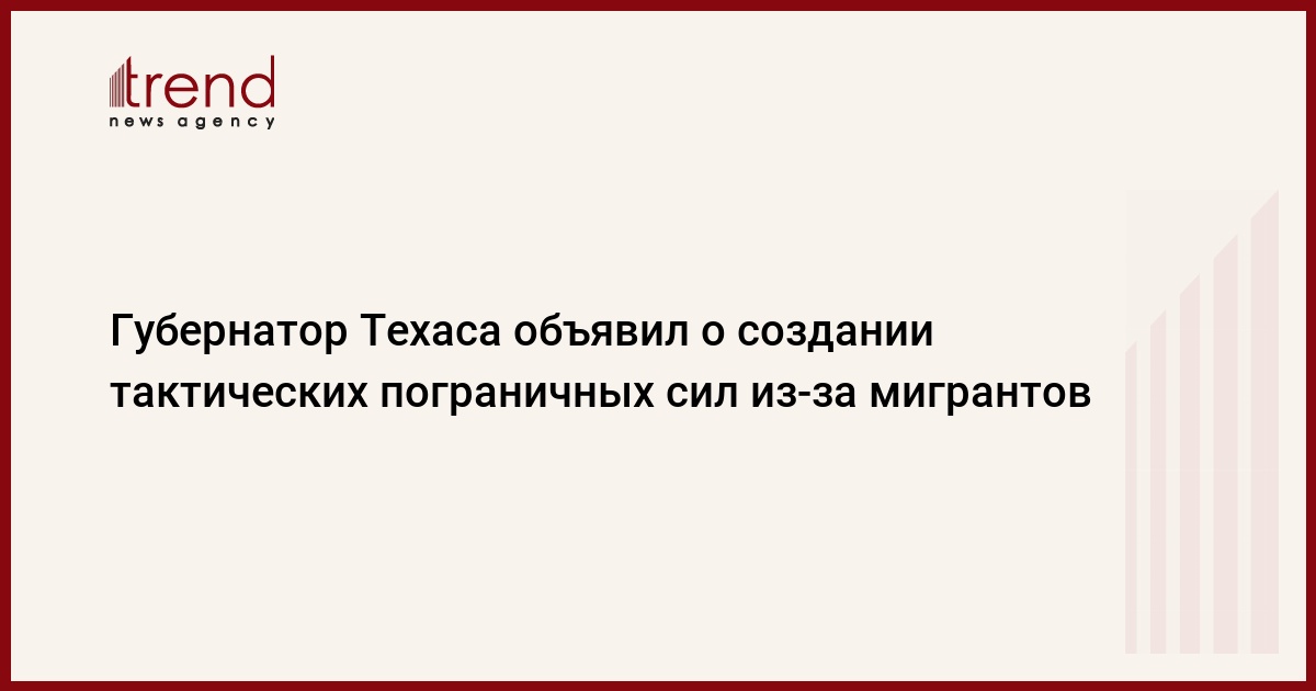 Губернатор американского штата Техас Грег Эбботт объявил о создании "Техасских тактических пограничных сил" в связи с усугубляющимся миграционным кризисом. Об этом в понедельник сообщило местное отделение телеканала ABC, передает Trend со ссылкой на ТАСС.
