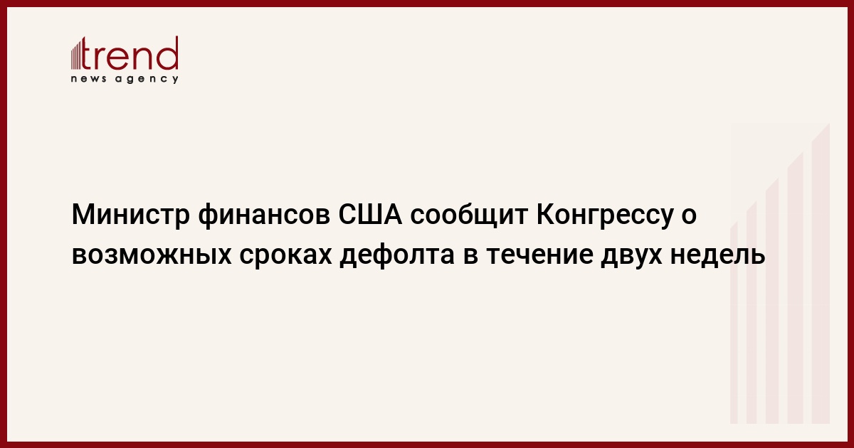 Министр финансов США Джанет Йеллен намерена известить Конгресс о предположительных сроках дефолта в течение двух недель. Об этом она заявила в опубликованном в пятницу интервью агентству Bloomberg, передает Trend со ссылкой на ТАСС.