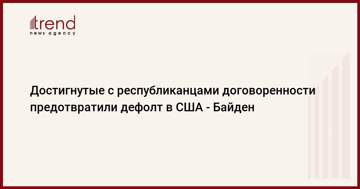 БАКУ /Trend/ - В результате соглашения между Белым домом и республиканцами Палаты представителей Конгресса США были достигнуты важные договоренности, предотвращающие возможный катастрофический дефолт и экономическую рецессию в стране. Об этом, как передает Trend, заявил американский президент Джо Байден в письменном сообщении, распространенном в субботу. Он отметил, что соглашение является компромиссом, благоприятным для обеих сторон.
